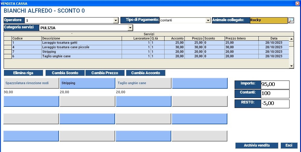 Il gestionale negozio animali e toelettatura consente la vendita veloce utilizzando semplicemente i tasti per la scelta delle categorie dei servizi.